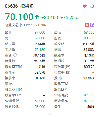 富途资讯3月27日消息,$极视角 (06636.HK)$暗盘现涨75.25%,报70.1港元,每手50股,不计手续费,一手赚1505港元。