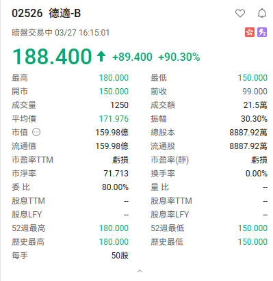 富途资讯3月27日消息,$德适-B (02526.HK)$暗盘现涨90.3%,报188.4港元,每手50股,不计手续费,一手赚4470港元。