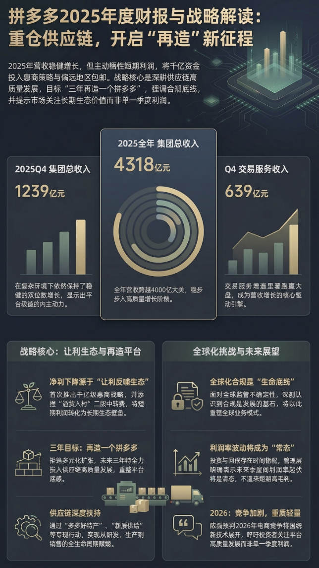 拼多多2025年四季度及全年营收保持稳健双位数增长,但在激烈的行业竞争和复杂的全球监管环境下,公司明确宣布主动牺牲短期利润,以“All in”的姿态重仓供应链,力图在下一个三年“再造一个拼多多”。