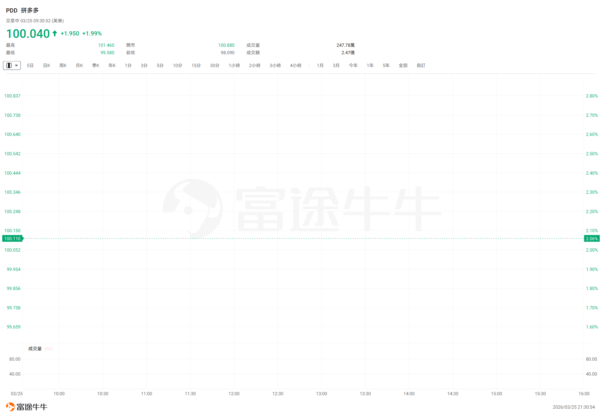 截止发稿,$拼多多 (PDD.US)$美股盘初涨近2%,成交额达2.47亿美元。