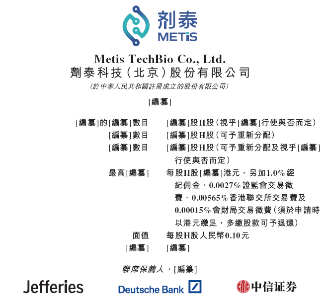 2026年3月25日,来自北京大兴区的剂泰科技(北京)股份有限公司 Metis TechBio Co., Ltd.(以下简称“剂泰科技”)在港交所披露招股书,其此前于2026年2月12日以保密形式递交招股书,拟香港主板IPO上市。