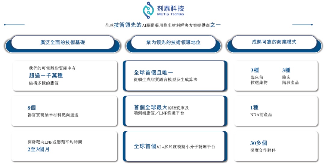 剂泰科技采用双轮驱动商业模式,将公司的专有AiTEM、AiLNP及AiRNA平台与内部开发的治疗资产协同整合,以实现解决方案平台商业价值的最大化。该模式结合了(i)向外部合作伙伴提供递送系统、脂质库及发现解决方案的平台战略合作模式;及(ii)通过许可、共同开发或商业化推进公司内部管线的产品合作关系。