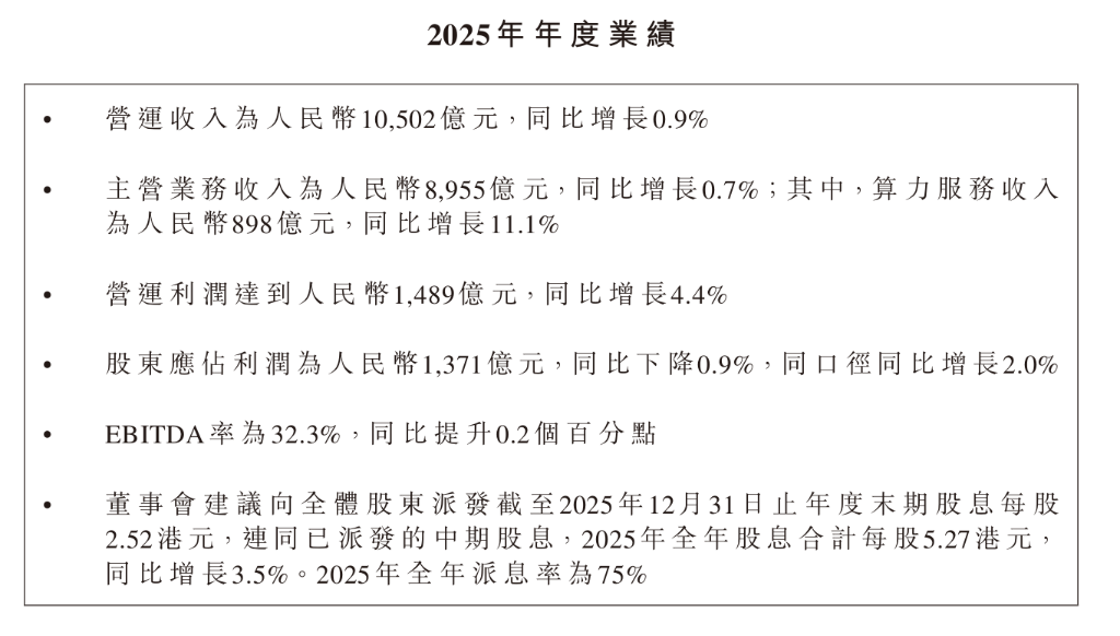 2025全年营运收入突破万亿元大关,达人民币10502亿元,同比增长0.9%;核心主营业务收入8955亿元,同比增长0.7%。面对传统通信业务增长放缓的压力,公司依托算力服务与智能服务的强劲拉动,整体盈利能力继续保持国际一流运营商水准。