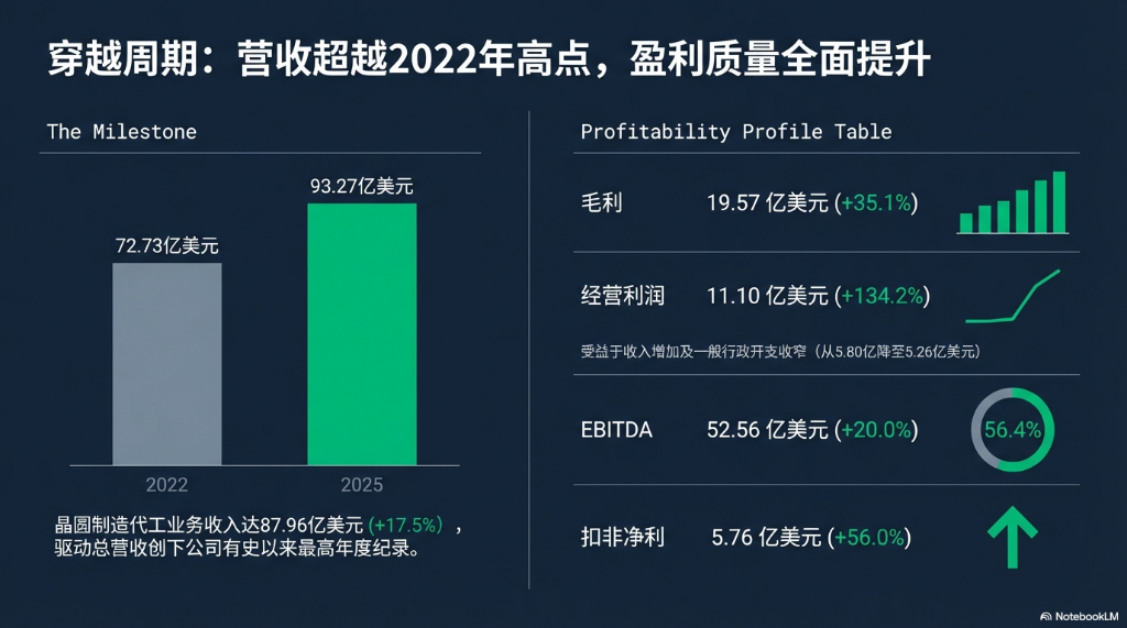 中芯国际2025年营收93.27亿美元,利润6.85亿美元,均创历史新高。月产能突破百万片,产能利用率升至93.5%带动毛利回暖。