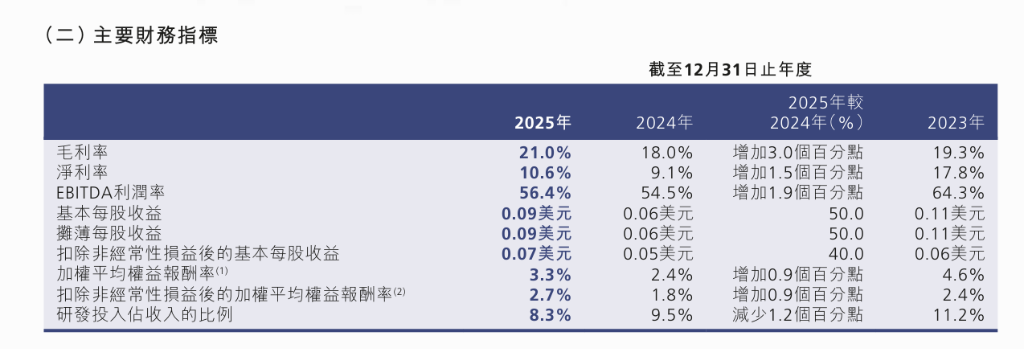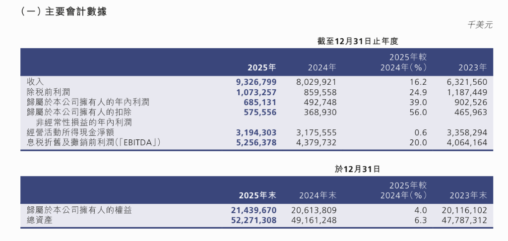 盈利能力全面改善。毛利由上年14.48亿美元增至19.57亿美元,增幅35.1%。经营利润由上年4.74亿美元大幅增长134.2%至11.10亿美元,主要受益于收入增加及一般行政开支同比收窄(从5.80亿美元降至5.26亿美元)。归属母公司股东的扣除非经常性损益净利润为5.76亿美元,同比增长56.0%,增速高于含非经常性损益的净利润,盈利质量提升。EBITDA达52.56亿美元,同比增长20.0%,EBITDA利润率升至56.4%。