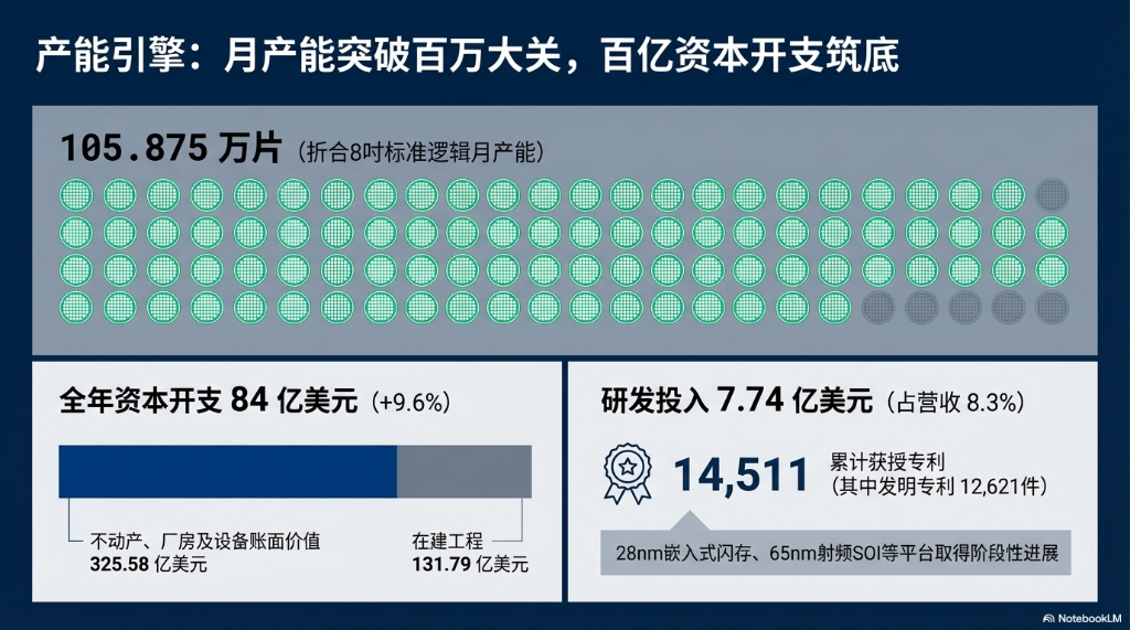 研发方面,2025年研发投入为7.74亿美元,占收入比例8.3%,较上年的9.5%有所下降,主要反映收入基数扩大。公司在28纳米嵌入式闪存平台、65纳米射频绝缘体上硅等多个平台取得阶段性进展,截至年末累计获授专利14,511件,其中发明专利12,621件。