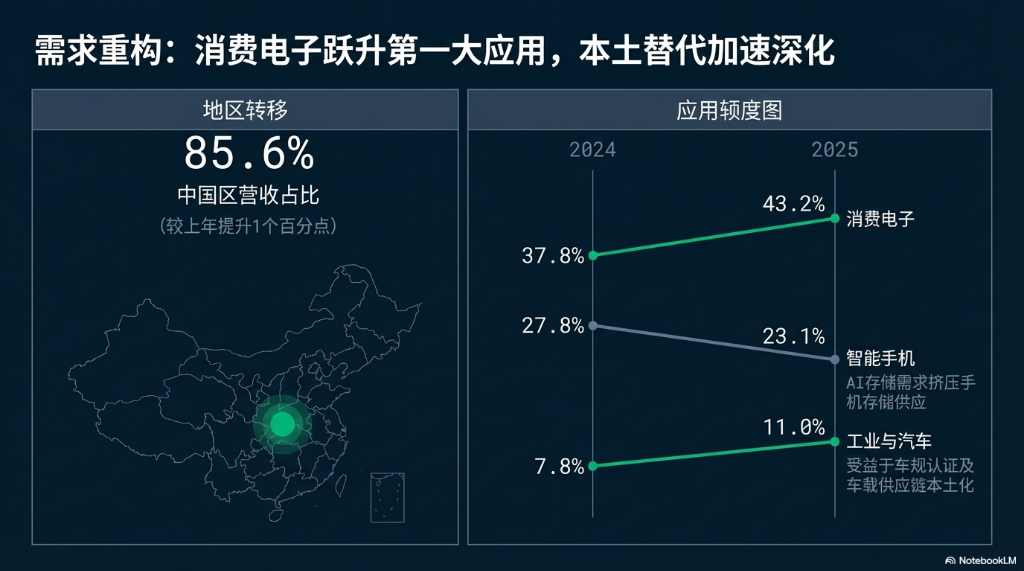 2025年中国区营收占比升至85.6%,较上年的84.6%进一步提高,本土化替代趋势延续。从应用结构来看,消费电子类晶圆销售占比由37.8%扩大至43.2%,成为最大应用类别;智能手机占比从27.8%下降至23.1%;工业与汽车类占比从7.8%升至11.0%,受益于车规认证落地及国内车载电子供应链加速本土化。