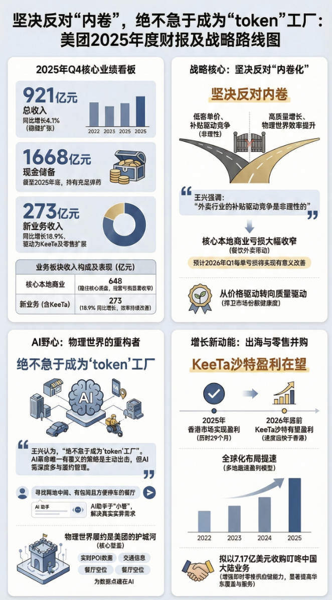 在今晚举行的美团2025年第四季度及全年业绩电话会议上,美团董事长兼CEO王兴与CFO陈少晖向市场交出了一份在复杂环境下稳健前行的答卷,并详细披露了公司在核心本地商业、AI战略、零售并购以及出海业务上的最新动向。