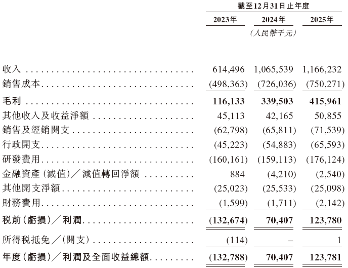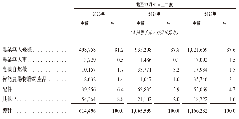 招股书显示,在过去的2023年、2024年和2025年,极飞科技的营业收入分别为人民币6.14亿、10.66亿和11.66亿元,相应的净利润分别为人民币-1.33亿、0.70亿和1.24亿元。