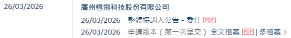 2026年3月26日,来自广东广州的广州极飞科技股份有限公司GUANGZHOU XAIRCRAFT TECHNOLOGY CO., LTD.(简称"极飞科技”)在港交所递交招股书,拟在香港主板挂牌上市。这是继其于2025年9月25日递表失效后的再一次申请。