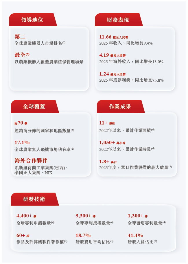 根据弗若斯特沙利文的资料,于2024年度极飞科技以10.7%和17.1%的市占率在世界农业机器人和农业无人飞机行业分别排名第二。
