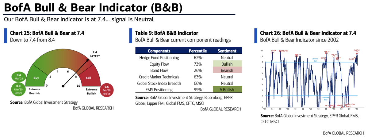 美银牛熊指标本周从8.4急降至7.4,为2025年7月以来最低水平,主要受全球股票指数广度恶化、高收益债及新兴市场债券资金外流、信用利差走阔等因素拖累。