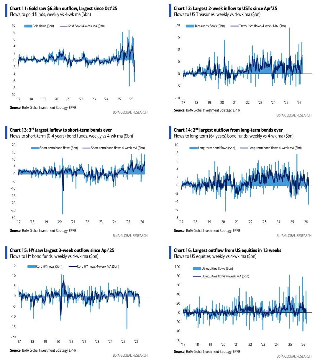 高收益债连续五周净流出,本周流出33亿美元,三周累计流出135亿美元,为2025年4月以来最大三周流出规模。黄金基金本周净流出63亿美元,创2025年10月以来最大单周流出。