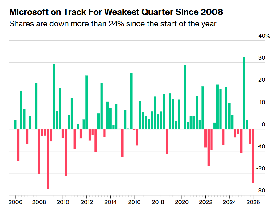 微软势将录得自2008年以来最差季度表现,AI从两个方向“咬噬”该公司增长前景。由于市场担心人工智能基础设施投资以及来自人工智能初创公司的竞争,微软股价正朝着全球金融危机以来最糟糕的季度表现迈进。