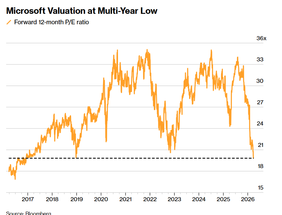 这轮抛售甚至使得该股看上去相对科技巨头以及纳斯达克指数而言更加便宜,基于未来12个月的预期市盈率甚至低于20倍,为2016年6月以来最低。如下面的图表所示,微软估值处于多年低位。
