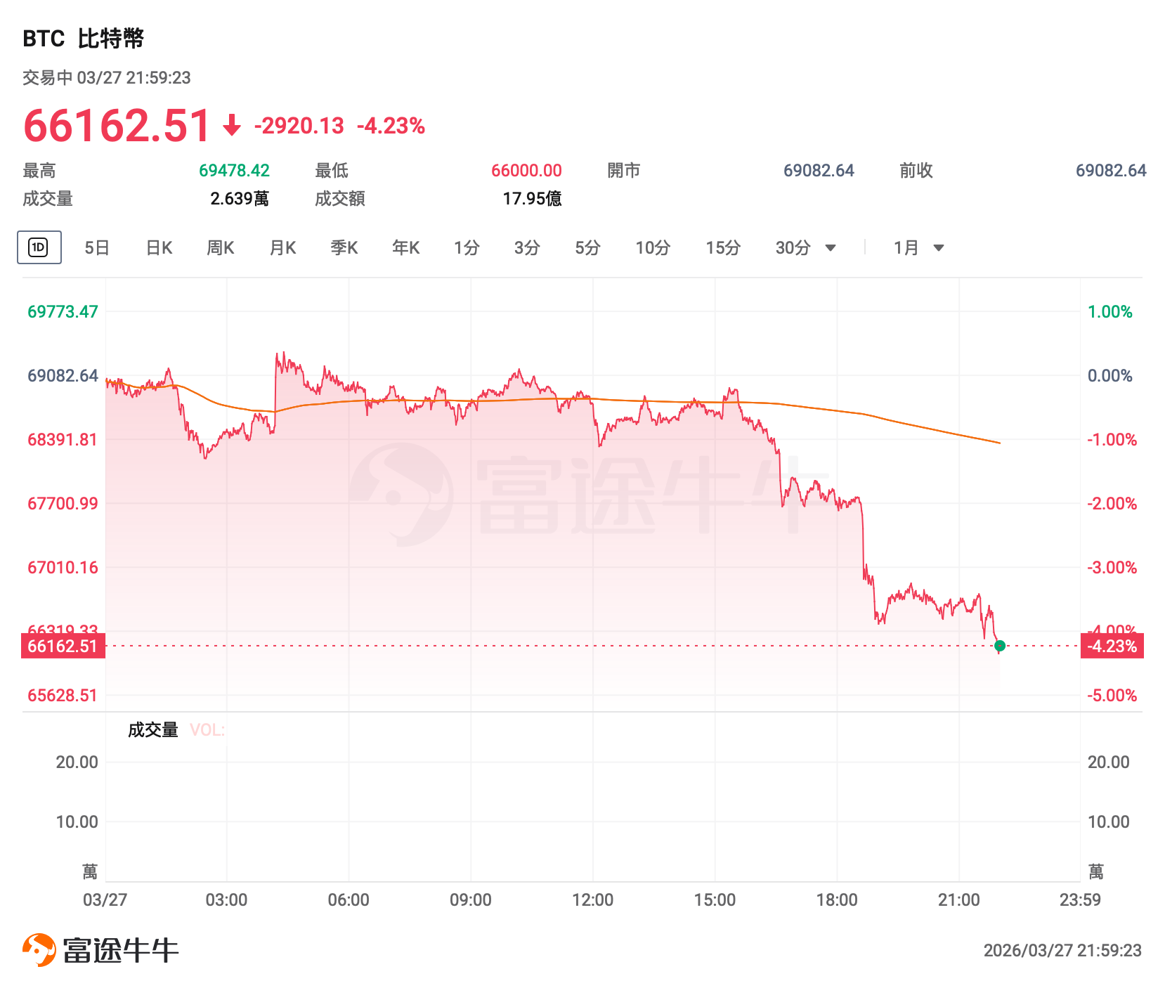 比特币盘中最深跌幅超4%,最低触及66162美元,创3月9日以来新低。近期这一主流加密货币始终在6万至7.5万美元区间震荡,远低于去年10月市场全面暴跌前约12.6万美元的历史高点。