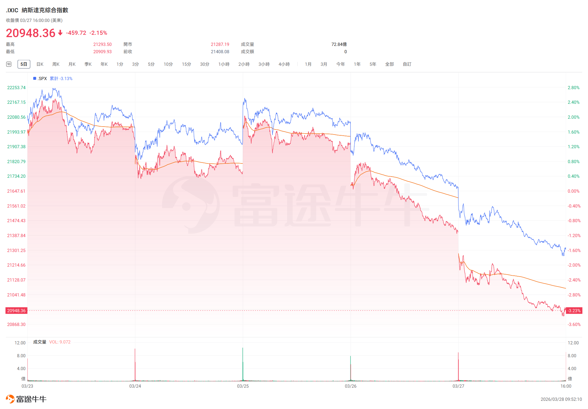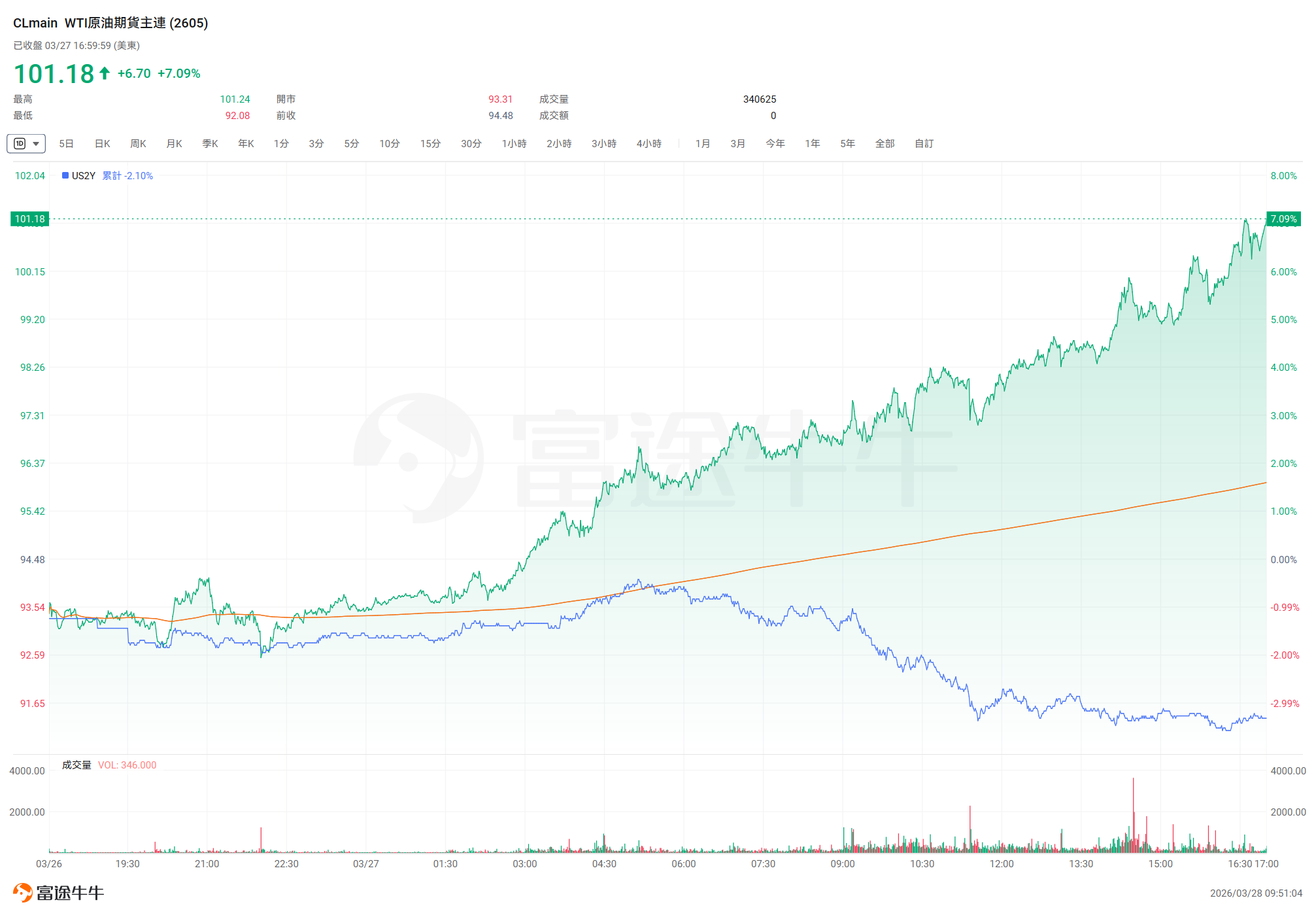 周五,伴随着美国和伊朗冲突的持续发酵,基准 $WTI原油期货主连 (2605) (CLmain.US)$ 升至每桶101.24美元的多年高位,纳斯达克综合指数则跌入修正区间。然而,对美联储货币政策高度敏感的美 $美国2年期国债收益率 (US2Y.BD)$ 却回落至3.90%。
