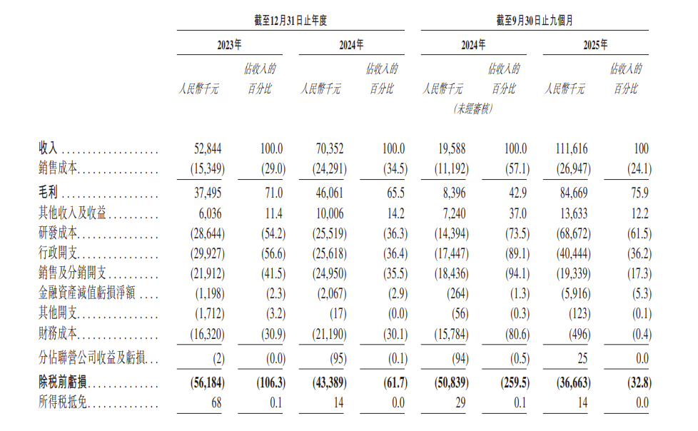 德适的收入由2023年的人民币52.8百万元增加33.1%至2024年的人民币70.4百万元,主要是由于公司于2024年从技术许可业务产生收入。2023年及2024年以及截至2024年及2025年9月30日止九个月,公司的毛利分别为人民币37.5百万元、人民币46.1百万元、人民币8.4百万元及人民币84.7百万元;同期,公司的毛利率分别为71.0%、65.5%、42.9%及75.9%。