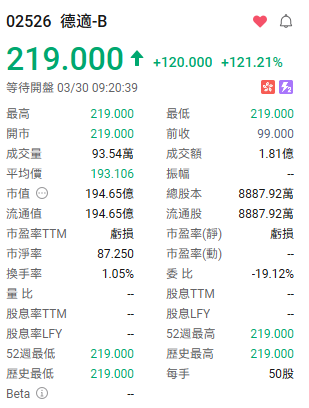 富途资讯3月30日消息, $德适-B (02526.HK)$ 首日高开,涨121.21%,截至发稿,报219港元;每手50股,不计手续费,一手赚6000港元。