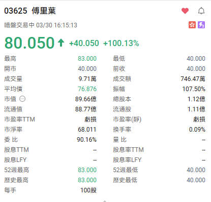 富途资讯3月30日消息,$傅里叶 (03625.HK)$暗盘现涨100.13%,报80.05港元,每手100股,不计手续费,一手赚4005港元。