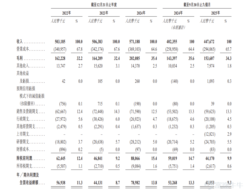 公司的毛利自截至2022年12月31日止年度的人民币162.2百万元增加1.2%至截至2023年12月31日止年度的人民币164.2百万元,而公司的毛利率保持稳定,分别为32.2%及32.4%;自截至2023年12月31日止年度的人民币164.2百万元增加23.1%至截至2024年12月31日止年度的人民币202.1百万元,而毛利率自2023年的32.4%上升至2024年的35.4%。