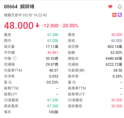 富途资讯3月30日消息,$铜师傅 (00664.HK)$暗盘现跌20%,报48.00港元,总市值近31亿港元。