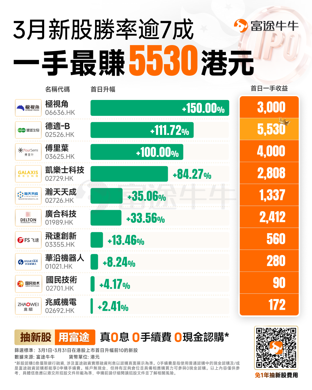 认购倍数来看,$优乐赛共享 (02649.HK)$公开发售阶段超额认购倍数达5297.23倍,为3月认购榜首位、年内第二;$华沿机器人 (01021.HK)$认购倍数为5059.38,月内排名第二;$极视角 (06636.HK)$以4591.37倍位居3月第三,年内第五。