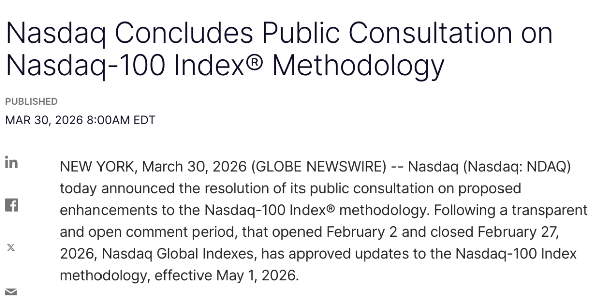 ①纳斯达克宣布自5月1日起实施纳斯达克100指数编制规则调整;②其中“快速准入”新规被普遍认为是在为SpaceX、OpenAI、Anthropic等超级AI独角兽上市铺路。