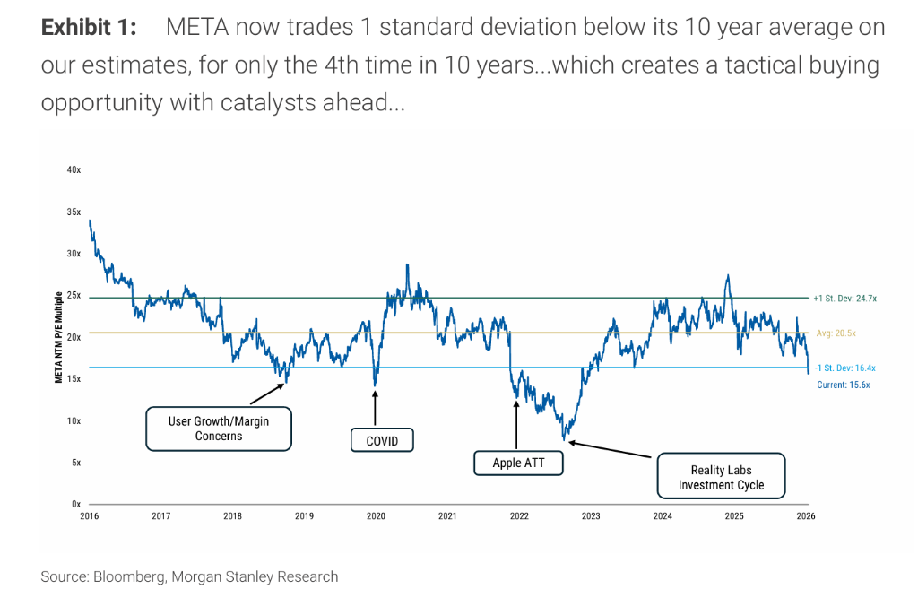 摩根士丹利认为,市场对 $Meta Platforms (META.US)$ 的悲观情绪已触底,当前估值水平创造出罕见的战术性买入窗口,同时将其列为首选股。