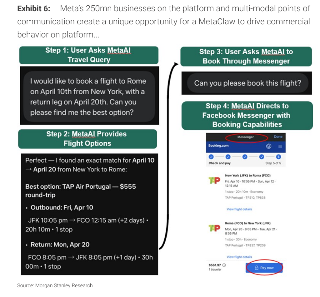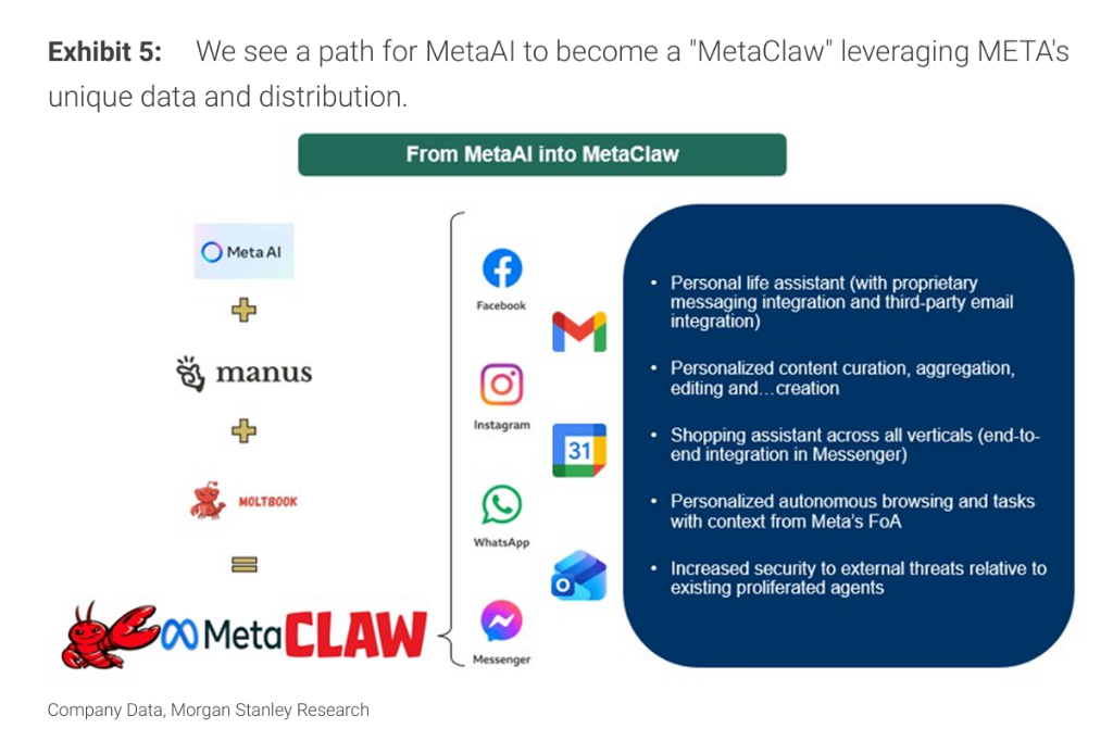大摩描绘的MetaClaw框架以Manus和更强版本的Llama大语言模型为基础,以Moltbook作为用户个人代理之间互联的中间层,叠加Meta在Facebook、Messenger、Instagram和WhatsApp上覆盖的35亿以上日活用户、2.5亿家商户及超1000万广告主所构成的多模态商业生态,形成一个潜在的闭环AI代理购物与服务平台。据报道,Meta已在测试将Gmail和谷歌日历整合至其代理产品中。