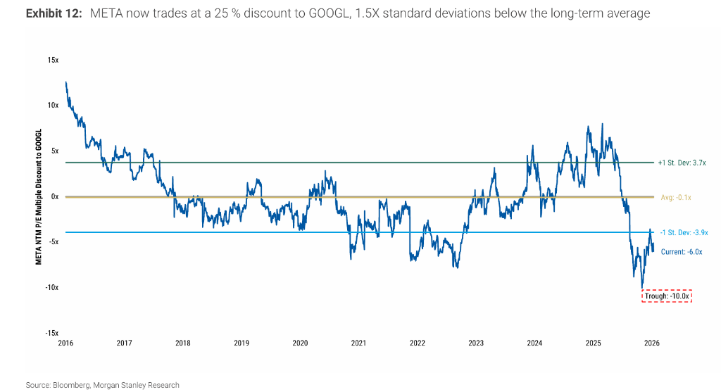 Meta当前估值水平在大摩覆盖的同类大市值科技股中已处于显著折价区间。
