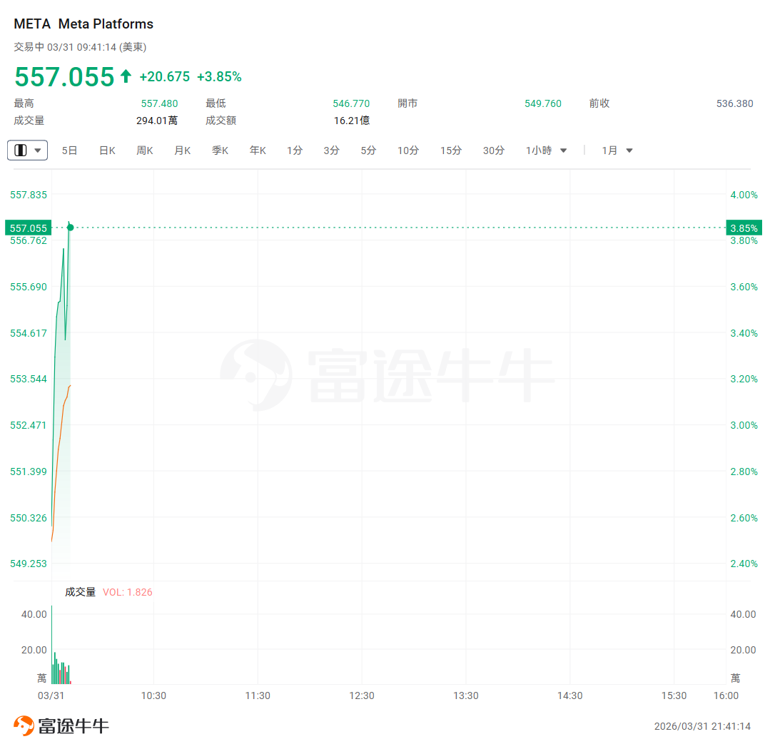 截止目前, $Meta Platforms (META.US)$ 盘初拉升涨近4%。