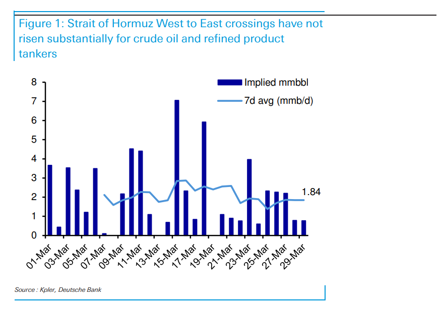 截至3月29日,7日均值过境量仅为每日180万桶,与伊朗原油出口量(约每日150万桶)相差无几。