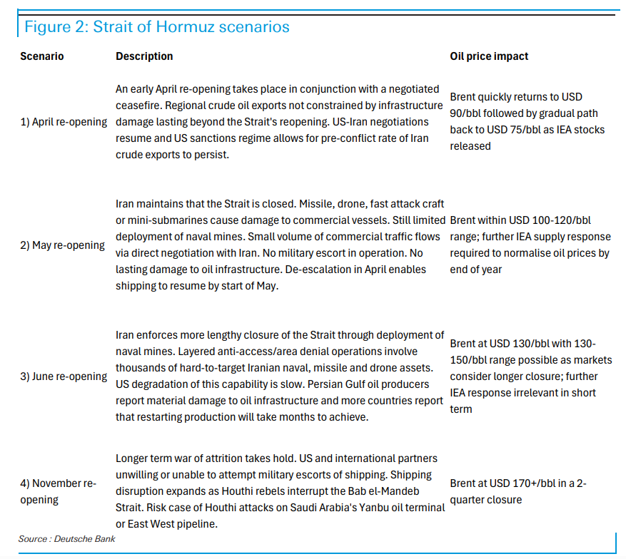 德意志银行构建了四个情景,以海峡封锁持续时长为核心变量: