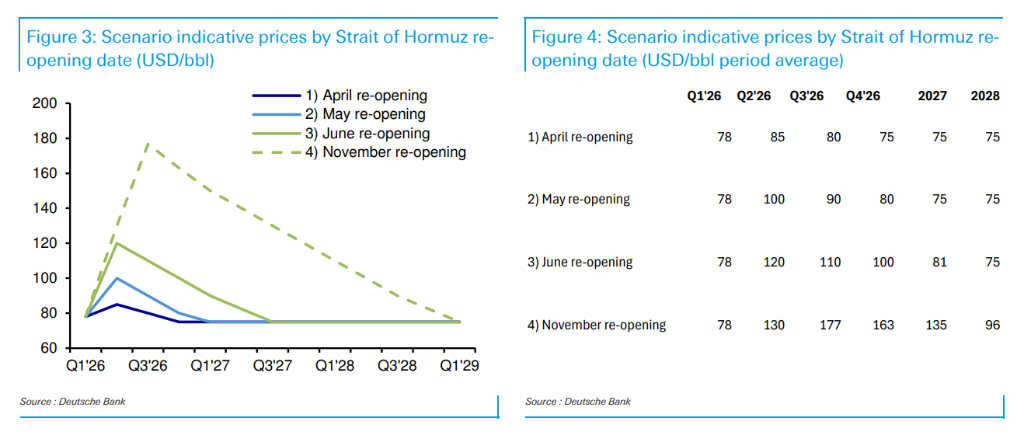 德意志银行设定四大情景,若海峡4月重开布伦特原油迅速回落至每桶90美元,随后随IEA储备释放逐步回归75美元,但若封锁持续至11月(两个季度),布伦特原油均价将达每桶177美元,区间在170至190美元之间。