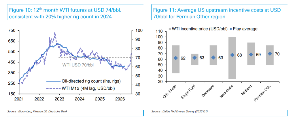 更值得注意的是,3月中旬至月底,美国石油钻井平台数量小幅下降至去年12月以来最低水平。德意志银行判断,在当前曲线结构下,美国供应响应不太可能以足够的规模和速度出现——除非情景四成真。