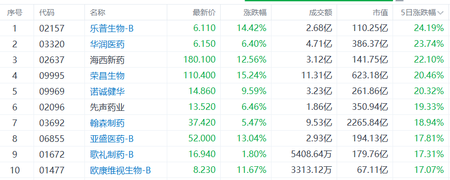 自上周起,创新药板块已显露爆发迹象。港股 $华润医药 (03320.HK)$ 、 $荣昌生物 (09995.HK)$ 、 $诺诚健华 (09969.HK)$ 近5个交易日累计涨超20%, $先声药业 (02096.HK)$ 、 $翰森制药 (03692.HK)$ 、 $歌礼制药-B (01672.HK)$ 等累计涨超17%。