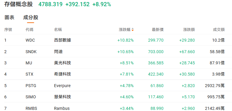 今日美股存储概念股延续强劲涨势, $西部数据 (WDC.US)$ 、 $闪迪 (SNDK.US)$ 大涨近11%, $美光科技 (MU.US)$涨超8%, $希捷科技 (STX.US)$ 涨近8%。