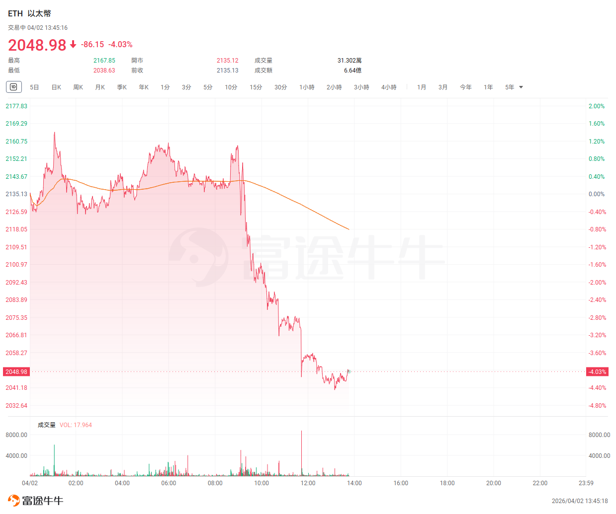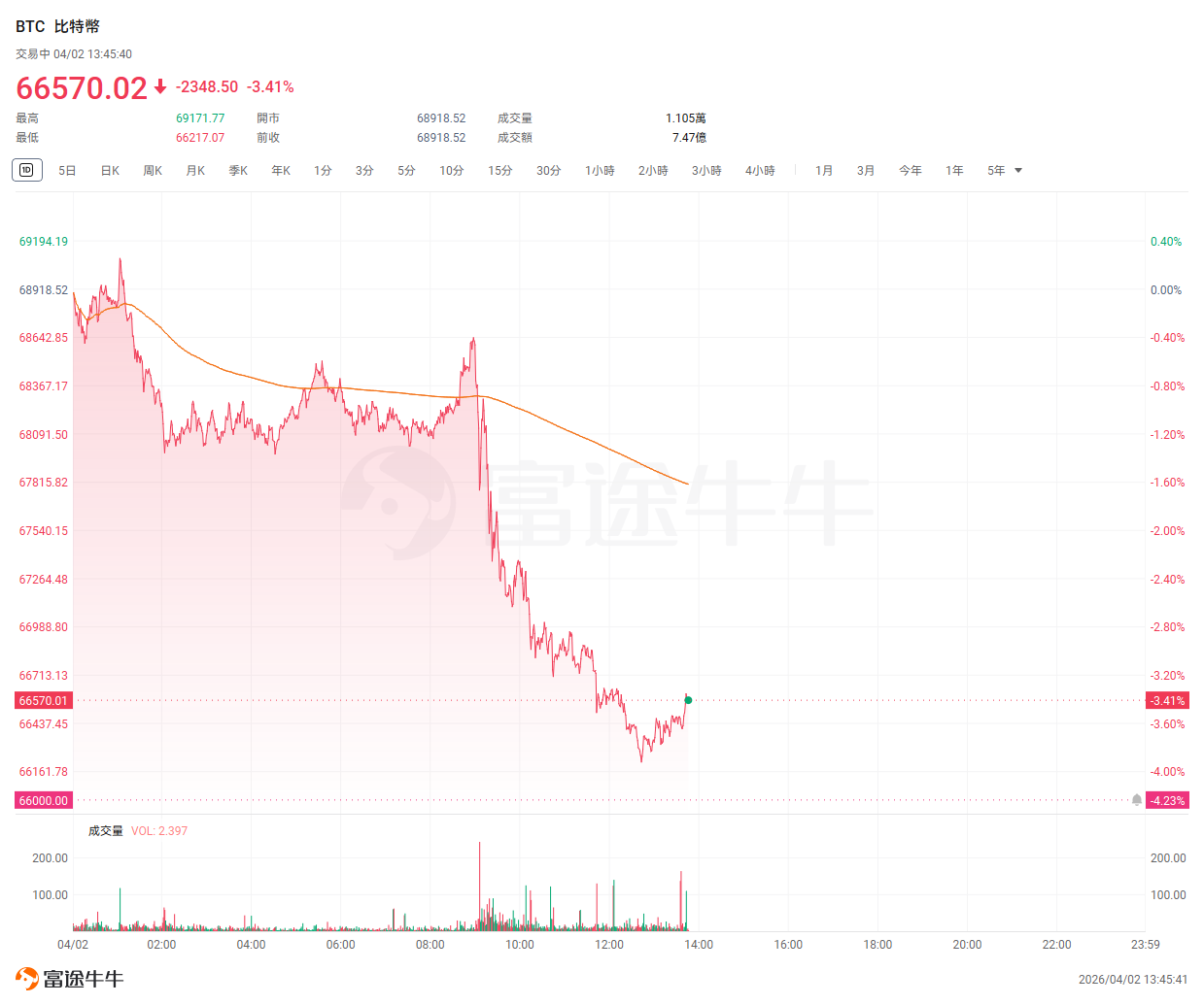 4月2日消息,加密货币市场下行,截至发稿, $比特币 (BTC.CC)$ 跌3.41%,报66570.02美元; $以太坊 (ETH.CC)$ 跌4.03%,报2048.98美元。