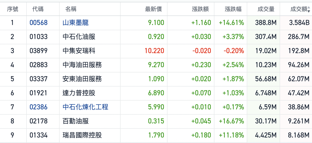 截至发稿, $山东墨龙 (00568.HK)$ 涨超14%、 $百勤油服 (02178.HK)$ 涨约17%, $延长石油国际 (00346.HK)$ 等多只个股纷纷上涨。