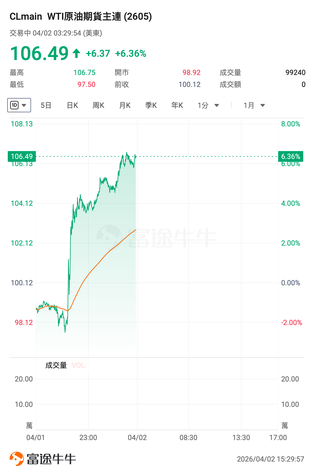 而随着特朗普冲突言论的升级,亚洲交易时段,国际原油期货随即跳涨。布伦特原油期货主力合约日内一度扩大涨幅至近7%。截至发稿,布伦特原油及WTI原油期货主连均涨超6%,站稳105美元/桶。