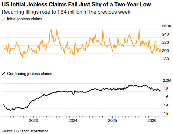 上周美国首次申请失业救济人数降至近两年来的最低水平之一,表明企业裁员力度依然较弱。
