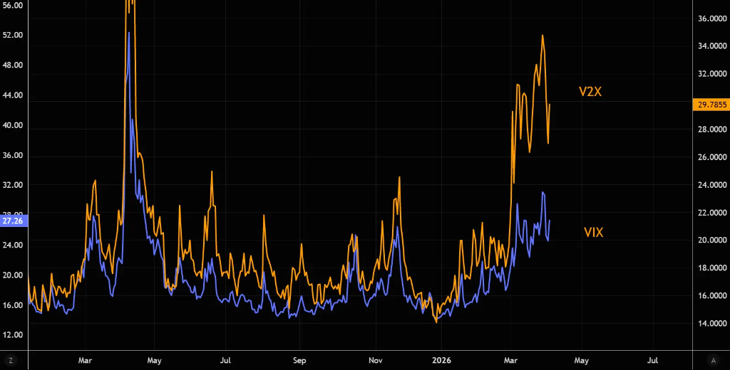 欧洲市场的隐忧更为突出。欧洲波动率指数V2X与VIX的差距持续维持在高位,伊朗局势的最新进展进一步暴露了欧洲资产的脆弱性。在此轮全球风险资产调整中,欧洲仍处于相对弱势地位。