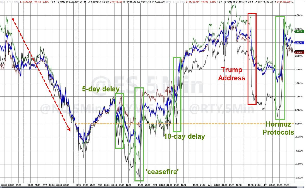 在此之前,由于特朗普暗示可能采取更激进的军事行动,加之耶稣受难日假期临近(美股周五将休市),油价上涨引发市场紧张情绪,美股开盘一度大跌。