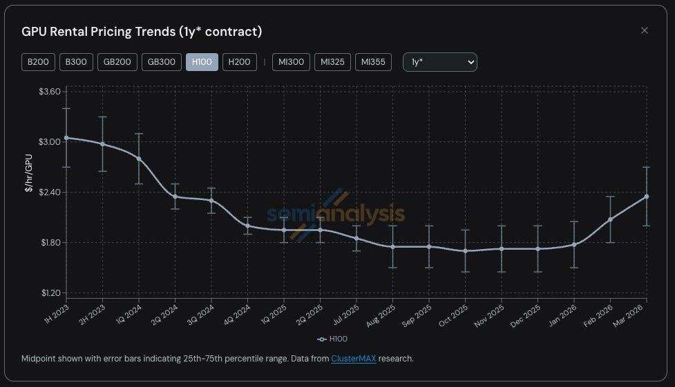 据行业研究机构SemiAnalysis最新发布的数据显示,$英伟达 (NVDA.US)$H100 GPU一年期租赁价格出现大幅飙升,截至2026年3月,一年期合约租金已从2025年10月的每GPU每小时1.70美元上涨至2.35美元,涨幅接近40%,全行业GPU算力资源已基本全线售罄。