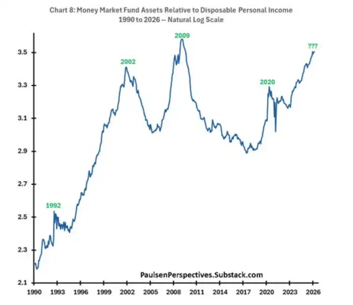 他表示,货币市场基金的“流动性激增”与1992年、2002年、2009年和2020年牛市开始前的流动性激增情况类似。