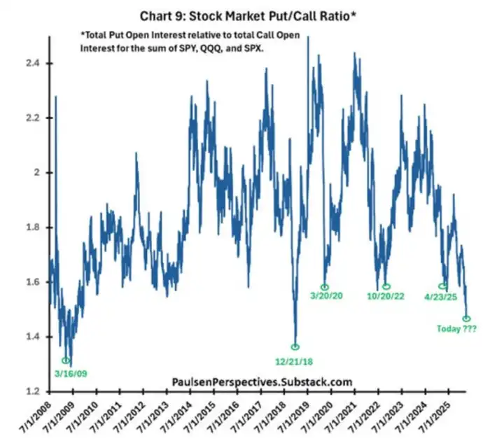 “如今的看跌/看涨期权比率处于或低于过去20年股市大幅上涨的起始水平。多头喜欢让投资者的保险(看跌期权)变得一文不值,而空头往往需要更多的看涨期权才能出手,”他说道。