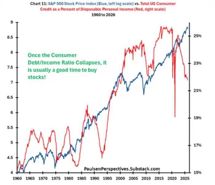 Paulsen表示,从历史数据来看,当消费者债务与收入的比率急剧下降时,这通常是股市的利好信号。他引用了过去60年标准普尔500指数和该比率的分析。