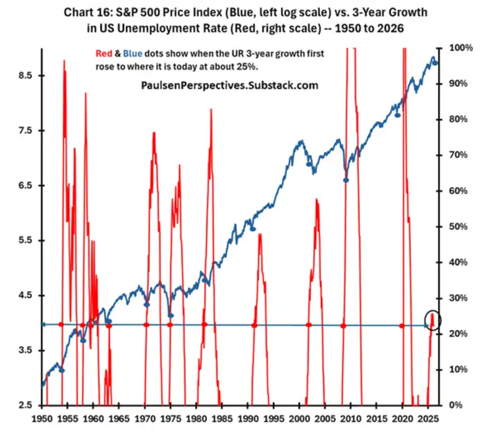 Paulsen表示,虽然失业率上升通常被认为对股市和经济不利,但过去多年的失业率飙升实际上与市场强劲增长时期有关。