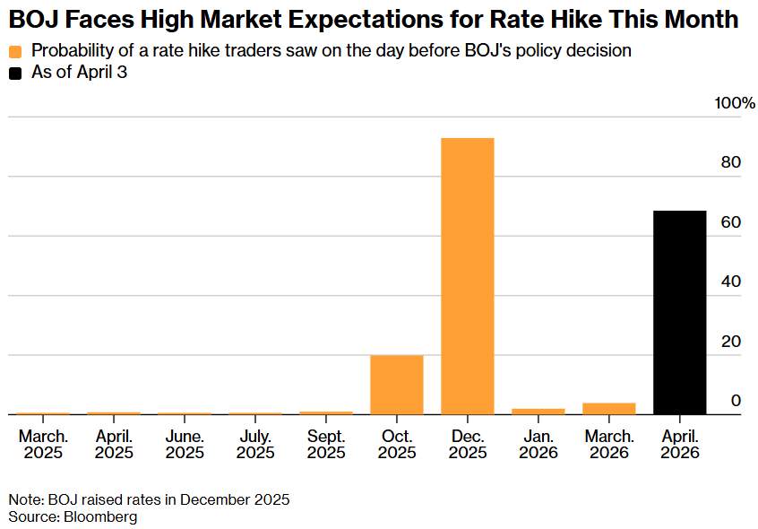日本央行如何在4月会议前传达其意图至关重要。交易员目前预计加息概率约为70%。如此高的预期意味着,加息不会让人太意外,而如果决定按兵不动,则可能会冲击已经因伊朗冲突演变而紧张的全球市场。